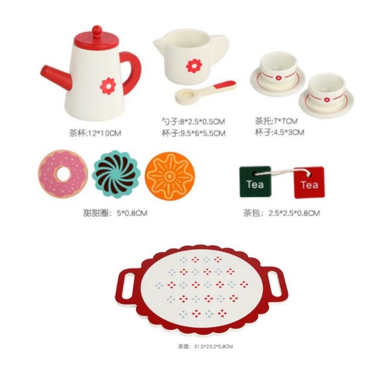 This wooden tea set features a playful aesthetic with bright, cheerful colors and adorable details such as the cookie-inspired doughnuts and the red and white floral pattern. The set includes everything your child needs to host an afternoon tea party, from a teapot and milk pot to teacups, spoons, and even tea bags. The design is both modern and charming, making it perfect for any little tea enthusiast looking to have fun with friends or by themselves.