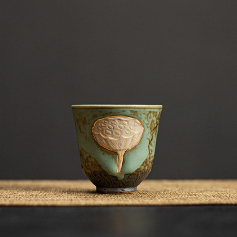 The lotus pod design is not only a visual highlight but also carries deep symbolic meaning in many cultures. In Japanese and other Asian traditions, the lotus represents purity and spiritual enlightenment. The inlaid lotus pod is delicately sculpted and seamlessly integrated into the ceramic surface, creating a beautiful contrast with the soft green and light blue glazes. The design on these handmade Japanese tea cups captures the elegance of the flower, making each cup a unique piece of art.