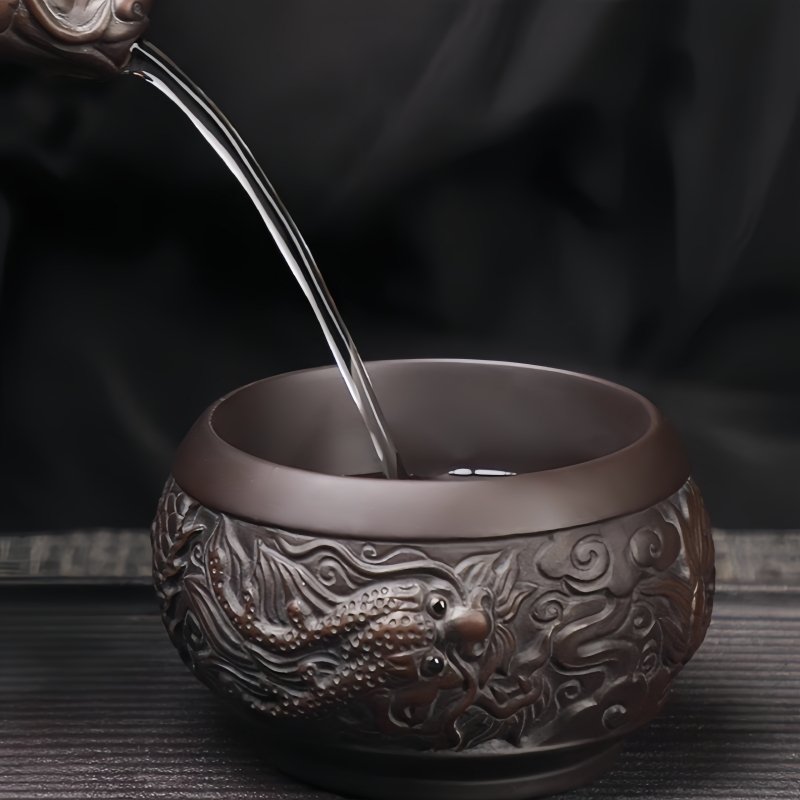 The dragon, a revered figure in Chinese culture, is intricately carved around the exterior of the cup, giving it both a visual and symbolic presence. The use of the dragon design adds an aura of good fortune and strength, elevating the traditional tea-drinking experience to one of cultural richness and artistry. For those who appreciate the beauty of dragon-inspired tea ware, check out our dragon tea cup set for a selection of similar, dragon-themed designs.