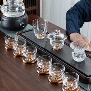 The glass is accentuated with gold accents, adding a touch of sophistication and luxury to each piece. This design is not only beautiful but also durable, ensuring that your set remains a centerpiece in your collection for years to come. If you’re looking for more glass tea options, you might enjoy exploring our clear glass tea cup set collection, which combines timeless beauty with practicality.