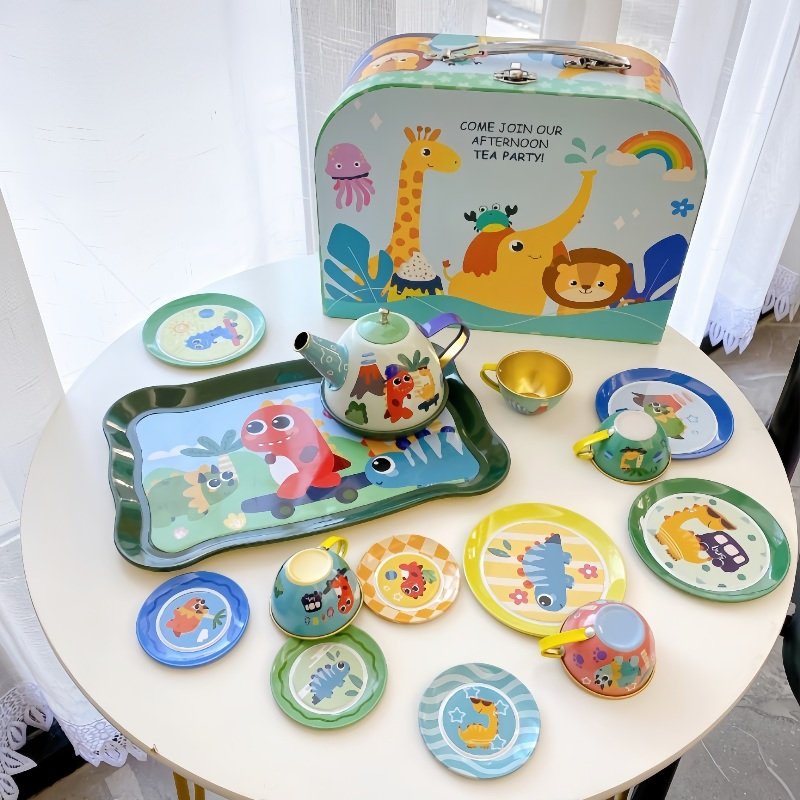Crafted from high-quality, non-toxic tinplate, this tea set is built to last. Unlike traditional porcelain or ceramic tea sets, this metal set is sturdy, ensuring that it can withstand daily play. The materials used are safe for young children, so you can rest easy knowing that your little one is playing with a non-toxic, durable product. For those interested in a smaller option, our mini teapot set collection offers a compact alternative for smaller hands.