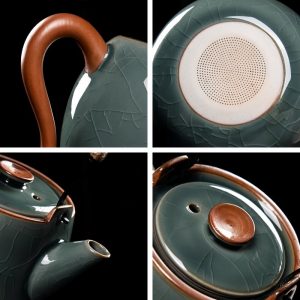 The dark green cracked glaze finish gives each piece a unique, textured appearance that is as beautiful as it is functional. This traditional technique has been perfected over centuries, creating a timeless design that evokes a sense of serenity. The glaze also enhances the tea’s flavor, allowing the taste to come through more clearly. The dark green color is both calming and elegant, making it the perfect addition to any tea lover’s collection. If you love intricate designs, our Chinese tea ceremony set features similar high-quality porcelain pieces.