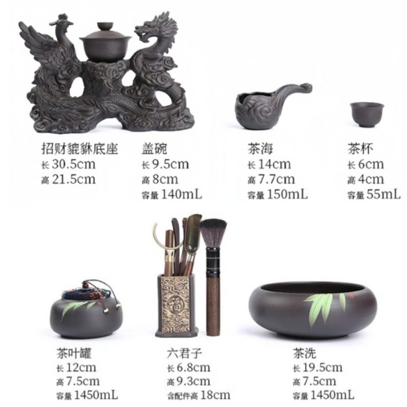 The centerpiece of this tea set features a stunning portrayal of the phoenix and dragon, two of the most revered creatures in Chinese mythology. The phoenix symbolizes beauty and grace, while the dragon represents strength, power, and good fortune. The beautifully crafted details bring these ancient symbols to life, adding a touch of mysticism and elegance to your tea rituals. This Chinese dragon tea set is a perfect example of combining art and culture, providing both visual delight and functional tea brewing. For a closer look, visit our Chinese dragon teapot, which features a matching design that complements this set beautifully.