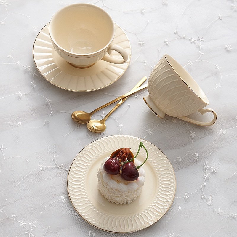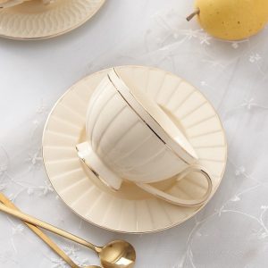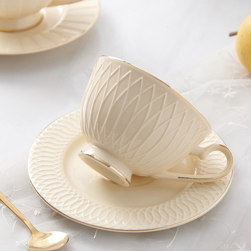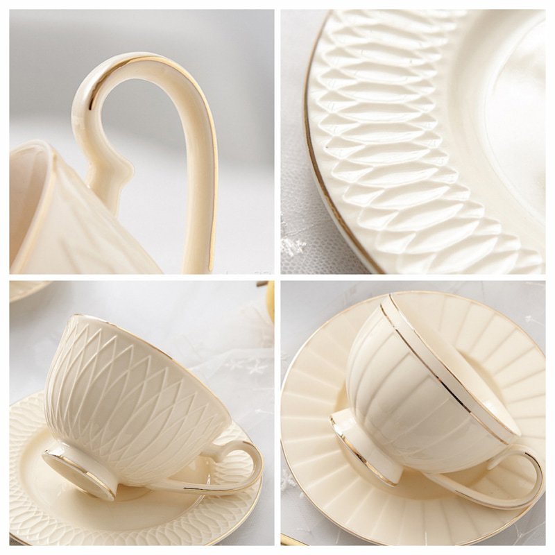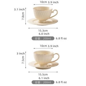 The signature feature of this tea cup set is the diamond pattern embossed on both the teacups and saucers. The intricate design provides a unique texture that enhances the visual appeal of the set. The golden edge detailing on both the cups and saucers adds a touch of luxury, making this set perfect for elegant tea parties or as an exquisite gift for tea lovers. This combination of classic patterns and fine craftsmanship creates a set that is both timeless and modern.