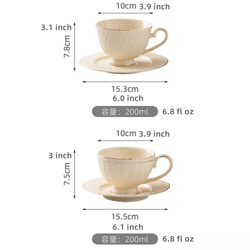 The Diamond Pattern Bone China Tea Cup Set is available in two elegant variations, Set A and Set B, both offering the same high-quality craftsmanship but with subtle differences in dimensions and design details. Set A features a slightly larger teacup, while Set B offers a slightly more compact version. Both sets include the same beautiful diamond pattern and gold detailing, allowing you to choose the one that best suits your preferences or needs.