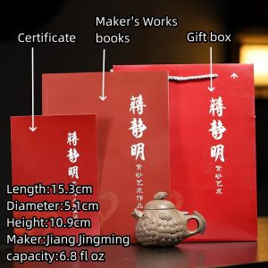 This Zisha teapot boasts intricate craftsmanship by the famous artisan Jiang Jingming, whose works are highly sought after. The attention to detail in the design, with fish accents and delicate curves, makes this teapot a collector’s item. Each teapot is accompanied by a certificate of authenticity and a special gift box, perfect for gifting to a fellow tea lover or adding to your collection.