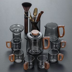 The wooden handle on the teapot adds both functionality and aesthetic appeal. Its ergonomic design makes it easy to pour tea without worrying about burns, providing comfort and safety. The combination of glass and wood creates a sleek, minimalist design, making the tea set an excellent choice for modern homes, cafes, or even as a thoughtful gift for a tea lover.