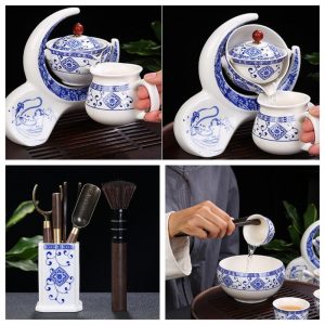 Be the first to review “Elegant Blue and White Porcelain Lazy Semi Automatic Tea Set with Moon Shape Stand”