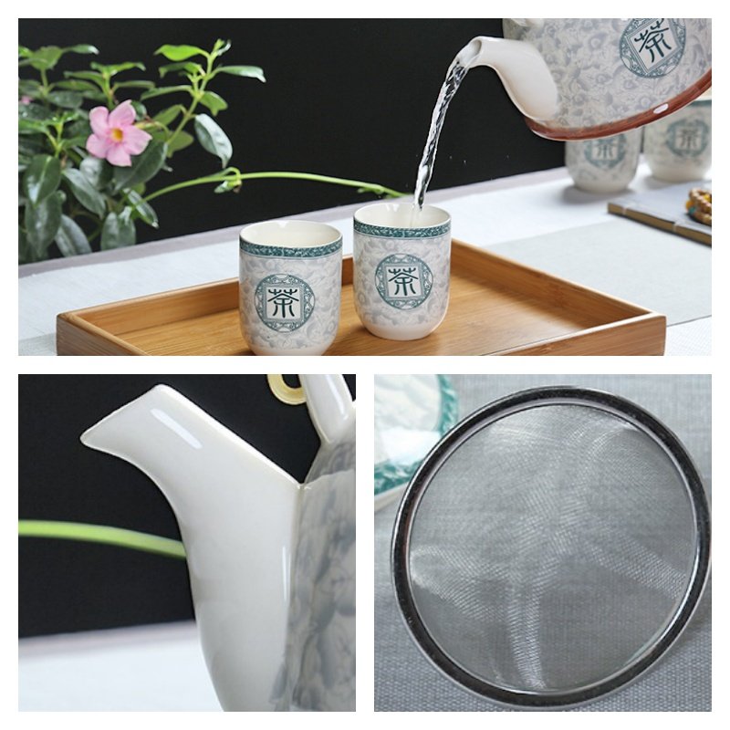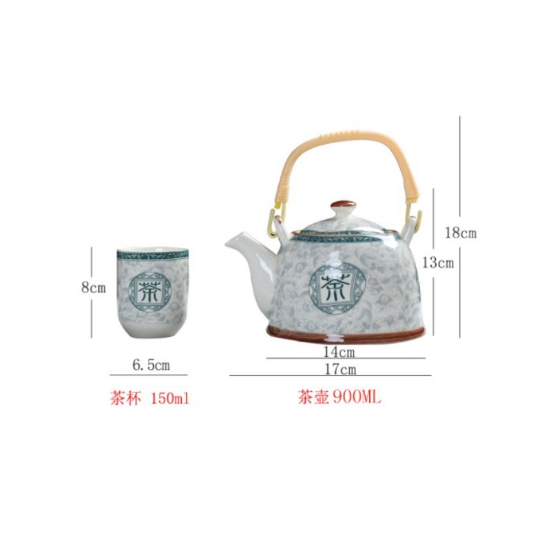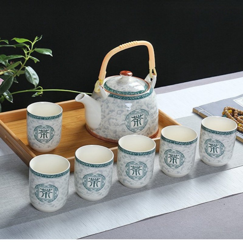 This teapot set features the iconic Chinese character “Cha” (tea) beautifully adorned on each piece. The intricate vintage-inspired design and soft green detailing make it an elegant addition to any Chinese tea set. The traditional aesthetics of this set ensure it will be the centerpiece of your tea sessions.