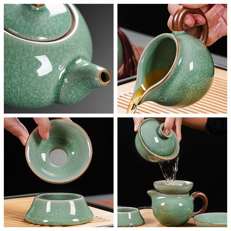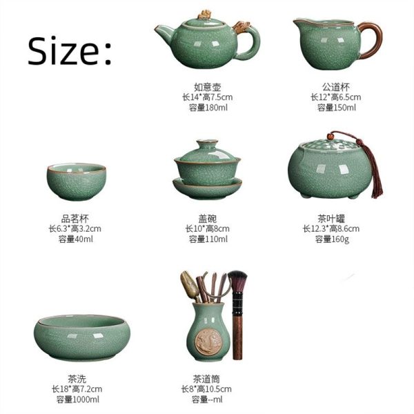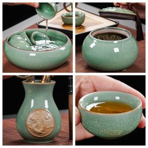 This set is a perfect example of a traditional Chinese tea set, combining artistry with functionality. The rich green tones and intricate dragon motifs add depth to the visual appeal, while the cracked ice glaze provides a smooth and refined texture that complements the visual aesthetics.