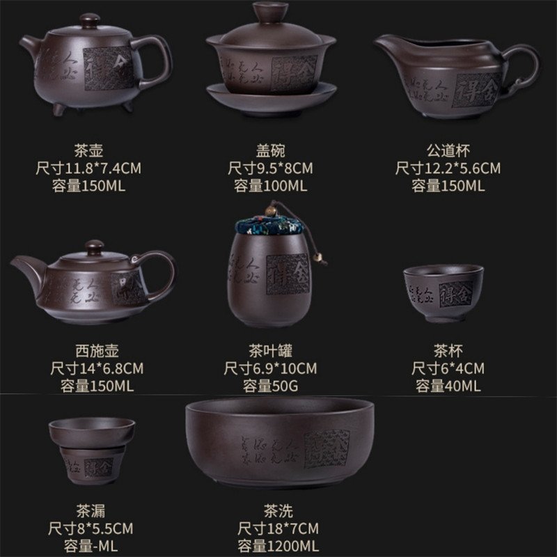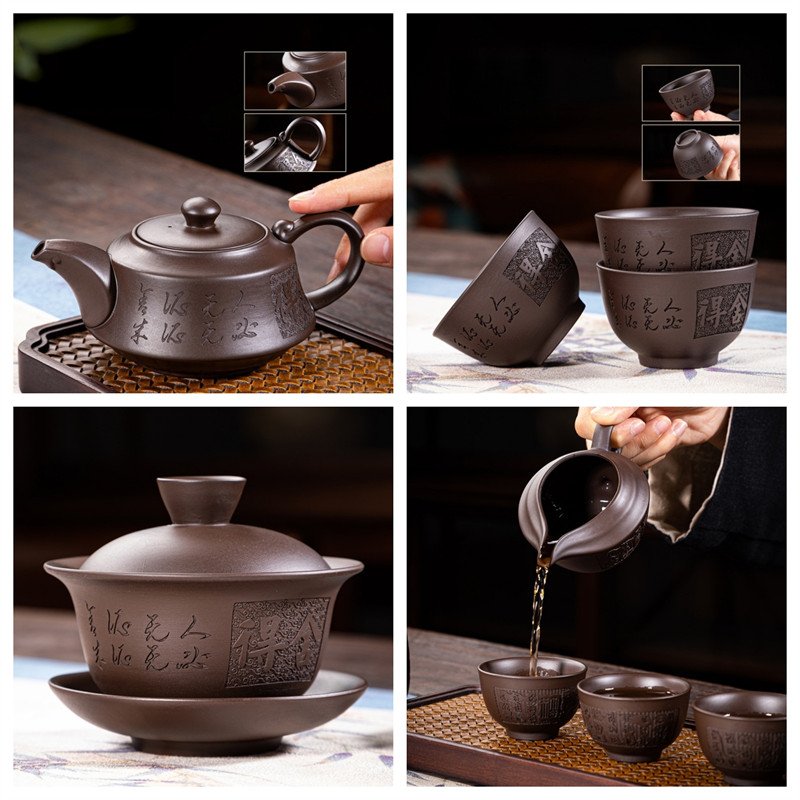 The Exquisite Purple Clay Yixing Zisha Tea Set Carved with Chinese Characters is a beautifully crafted tea set featuring a Yixing teapot and cups, ideal for a complete tea ceremony with a 150 ml teapot and 40 ml tea cups.