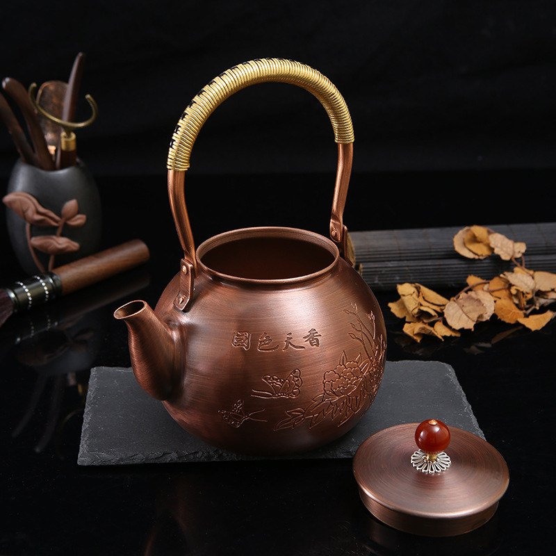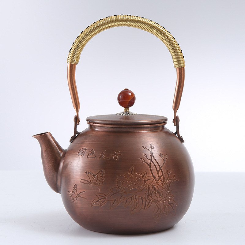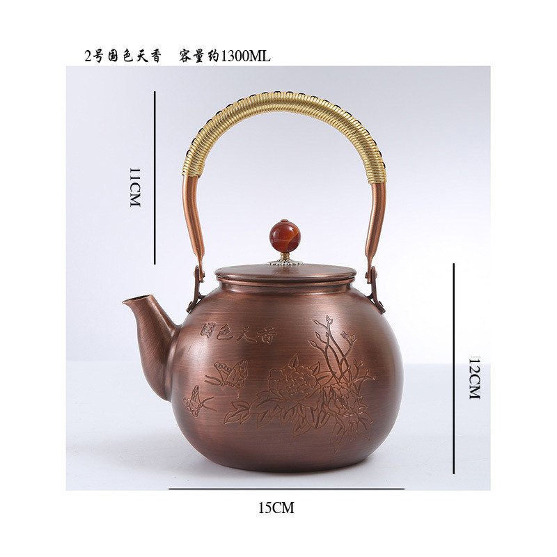 Introducing the Exquisite Solid Antique Copper Teapot Kettle with Intricate Peony and Butterfly Patterns, a true masterpiece of traditional craftsmanship. Made from high-quality copper, this teapot combines the warmth of antique styling with the delicacy of hand-engraved peony and butterfly patterns, symbolizing beauty and grace. Ideal for tea enthusiasts and collectors, this kettle offers a unique blend of function and aesthetic appeal. The copper tea kettle design is a nod to time-honored tea traditions while offering modern usability for everyday use.