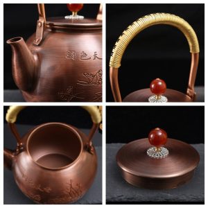 The peony and butterfly patterns on this teapot are a stunning testament to the artistry of traditional engraving. The peony, a symbol of wealth and prosperity, and the butterfly, representing joy and transformation, bring added meaning and beauty to this functional teapot. Each detail has been meticulously crafted to ensure that the intricate designs stand out beautifully on the polished copper surface. The teapot’s aesthetic appeal is enhanced by its flawless execution of these delicate patterns, making it a unique and timeless addition to any tea collection. If you’re a fan of ornamental designs, consider exploring our brass tea kettle, which also features stunning craftsmanship.