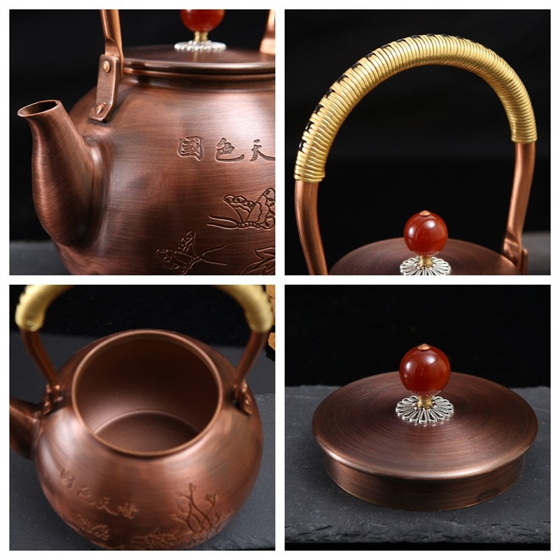 Not only does this teapot serve as a functional brewing tool, but it is also a beautiful decorative piece. The antique copper finish and the intricate butterfly and peony designs make it an eye-catching addition to any home. Place it in your kitchen or dining area for a touch of elegance that will surely impress your guests. For those who appreciate traditional craftsmanship, our Chinese teapot set is an excellent complementary piece to add to your collection.
