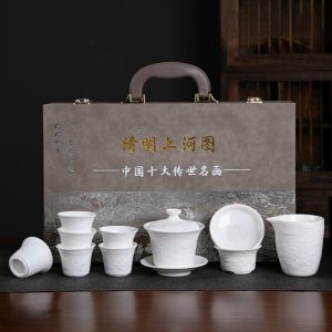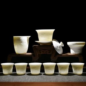 Mutton fat jade porcelain is a special type of ceramic that is prized for its smooth texture and beautiful appearance, resembling the shine and feel of jade. The Exquisite Traditional Chinese Tea Service Set with Antique Mutton Fat Jade Porcelain features detailed embossing, adding texture and visual interest to the set. The set’s unique design is further enhanced by its fine craftsmanship, ensuring it is not only functional but also a beautiful decorative piece for your home. This set will complement any Chinese teapot and cup set in your collection, creating a cohesive and elegant tea-drinking experience.