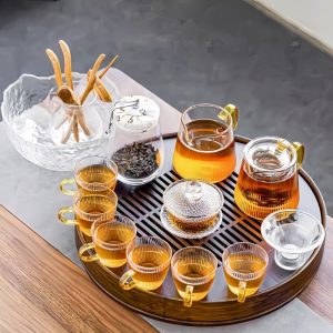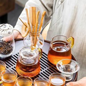 The Fancy Hammered Stripe Pattern Transparent Glass Tea Ceremony Set is crafted with precision, combining artistry and functionality to elevate your tea rituals. Made from high-quality borosilicate glass, this set is heat-resistant and built to last. Whether you’re enjoying tea with friends or indulging in a solo tea ceremony, this set will surely impress.