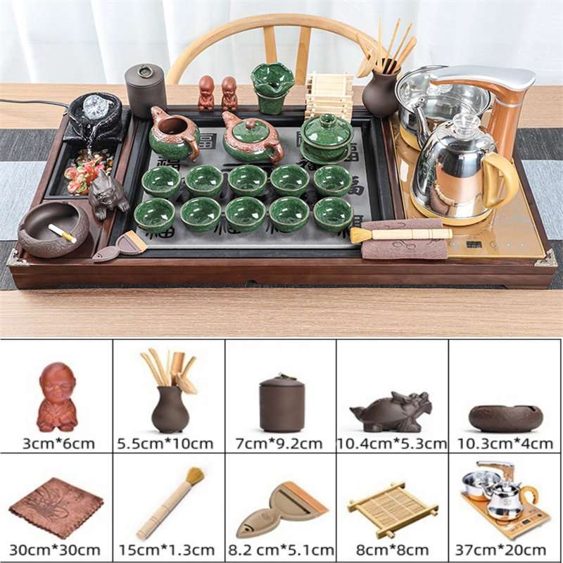 The flowing water design on the tea tray represents peace and serenity, making it the perfect base for your tea ceremony. The smooth, elegant tray allows you to brew and serve tea with ease while maintaining a clean and organized space. The design complements the emerald dragon cracked ceramic set perfectly, enhancing the overall aesthetic of the set. This tray provides a stable surface for all the components of your tea-making process, from the traditional Chinese tea set to the teapot and cups.