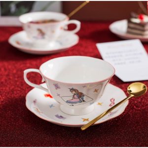 The design of this english bone china tea cups is inspired by the adventurous spirit of Alice, featuring delicate hand-painted illustrations of her floating through the air with stars and whimsical symbols surrounding her. This playful design makes each cup a conversation starter while maintaining the elegance expected from a vintage tea set. Each teacup and saucer has its own distinct charm with vibrant colors and gold accents, elevating the aesthetic of any table.
