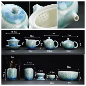 This tea set is available in two variations: Type A and Type B, each offering similar components but with slight variations in the teapot design. Both sets include eight teacups, a fair cup, a gaiwan, a tea infuser, a tea caddy, a tea washer, and a set of tea utensils. With this set, you have everything needed to enjoy a traditional Chinese tea ceremony. For those looking to pair this with elegant cups, consider the matching Chinese ceramic tea cups, which perfectly complement the set’s refined look.