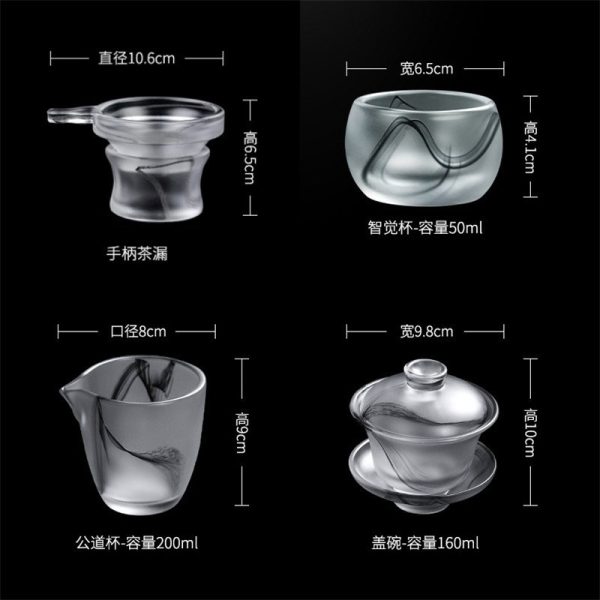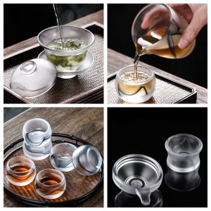 Our Glass Tea Set is made for those who appreciate both aesthetics and practicality. The Gaiwan, Fair Cup, Tea Infuser, and Tea Cups are designed for both personal and group tea sessions, providing the perfect balance of tradition and modern elegance. The Tea Infuser (10.6cm * 6.5cm) helps you brew your tea leaves to perfection, while the Fair Cup (8cm * 9cm, 200ml / 6.8 fl oz) ensures the even distribution of tea, allowing for an equal pour for all your guests.