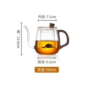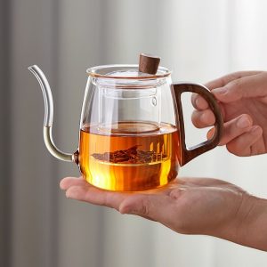 This teapot with filter is beautifully crafted with a transparent glass body, showcasing the rich colors of your tea as it brews. The gooseneck spout is specially designed for controlled pouring, making it ideal for pour-over tea brewing techniques. The ergonomic wooden handle adds a rustic touch, enhancing the teapot’s overall elegance. The visual beauty of the teapot makes it a great centerpiece for tea time with friends and family. It’s a perfect blend of functionality and style, and will make your tea brewing experience both enjoyable and aesthetically pleasing. Pair it with a clear glass tea set for a complete collection.