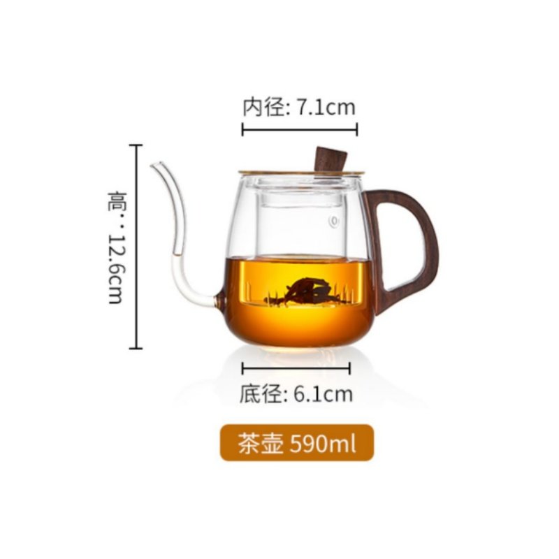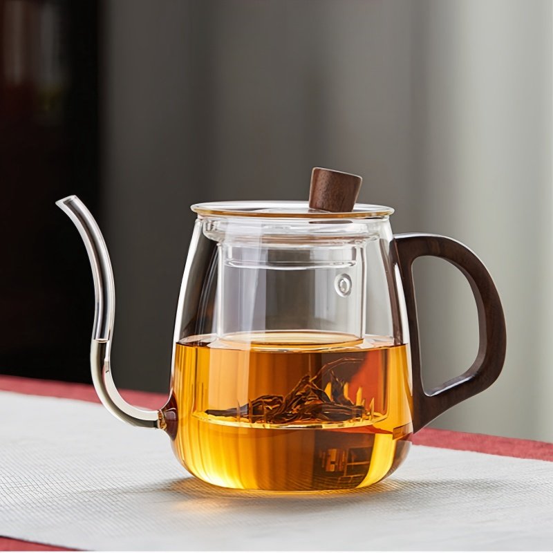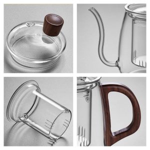The Glass Teapot with Gooseneck Spout and glass infuser with a wooden handle offers precise pouring and a smooth tea experience, making it an elegant addition to your tea collection.