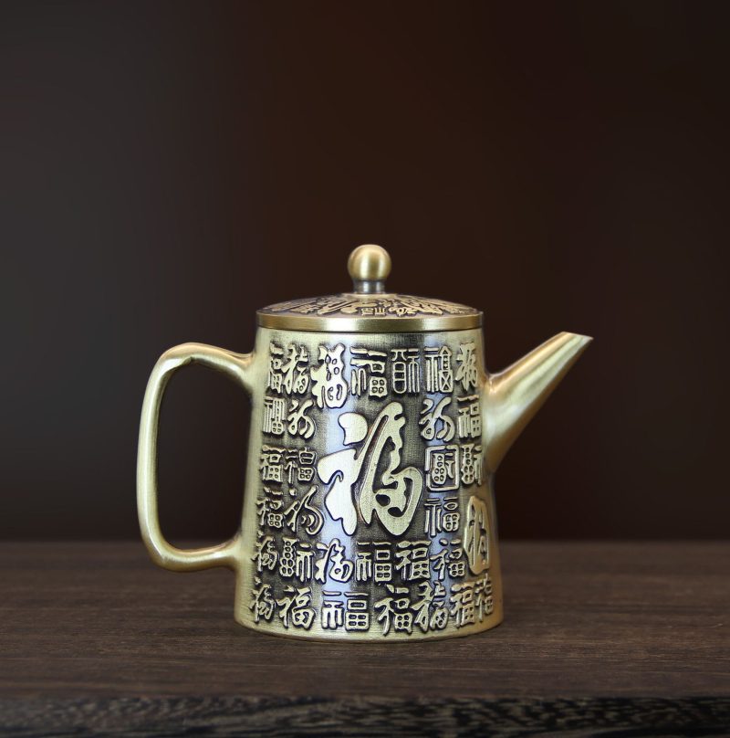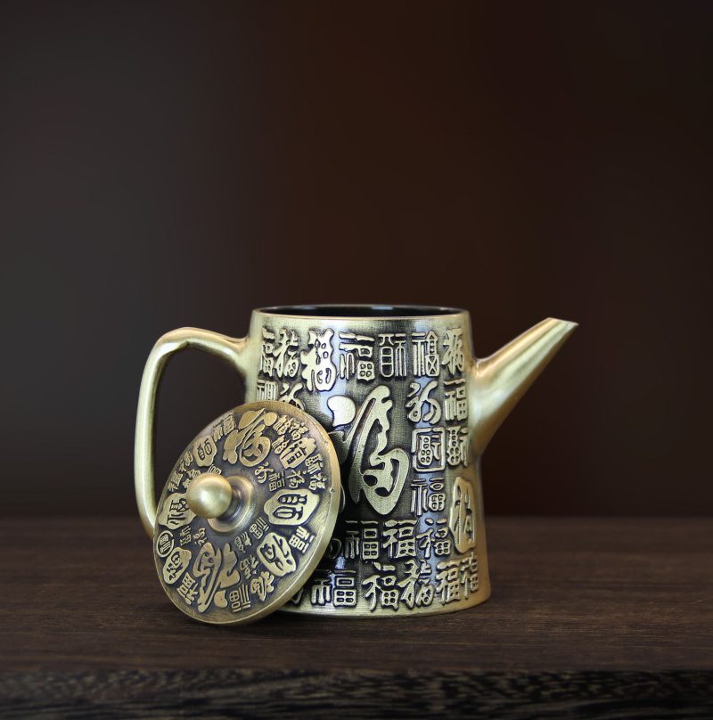 Elevate your tea-drinking experience with the Hand Carved Brass Kettle with Blessing Characters and Antique Tea Pot Lid, combining traditional Chinese symbolism and craftsmanship for a perfect addition to your tea collection.