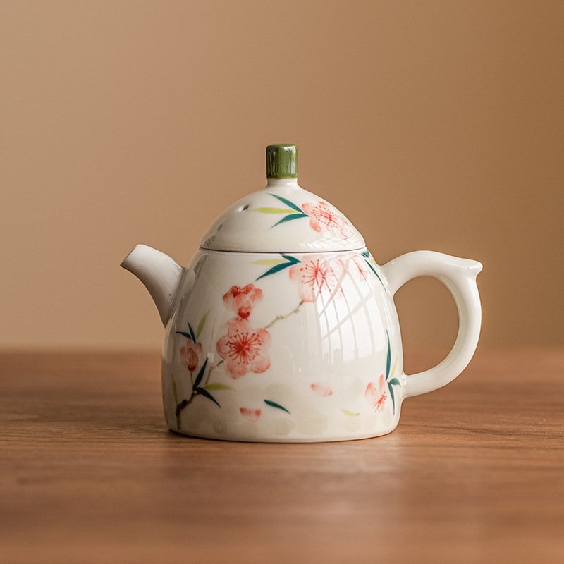 The delicate peach blossom design is emblematic of traditional Chinese art, which symbolizes beauty, resilience, and longevity. The intricate painting on the teapot is done by skilled artisans, showcasing the art of hand-painting that adds an antique charm to this miniature teapot. The soft pink hues of the blossoms contrast beautifully with the green cap, creating a delicate yet vibrant aesthetic. This teapot is a perfect addition to any collection of mini teapot, embodying a blend of functionality and visual appeal that makes it a standout piece.