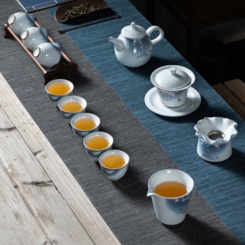 This tea set features an elegant fishpond motif, expertly hand-painted in blue tones, symbolizing tranquility and harmony. The soothing fishpond imagery brings to mind the peaceful, slow-moving waters of a pond, while the fine porcelain construction ensures that the design is not only aesthetically pleasing but also durable. Whether for everyday use or special occasions, this set adds a touch of nature and elegance to any tea ceremony.