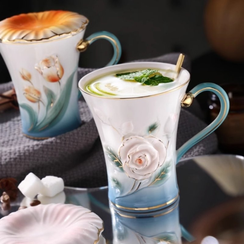 For those who enjoy the refined elegance of antique tea ware, the Handmade Blue Ceramic Pink Rose Tea Mug Cup and Petal Saucer pairs beautifully with an antique bone china tea set. Bone china’s lightweight and translucent quality complements the bold, colorful design of the mug, creating a sophisticated tea-drinking experience. This combination blends the beauty of porcelain with the artistic flair of ceramic, making it an ideal choice for those who appreciate fine tea sets.