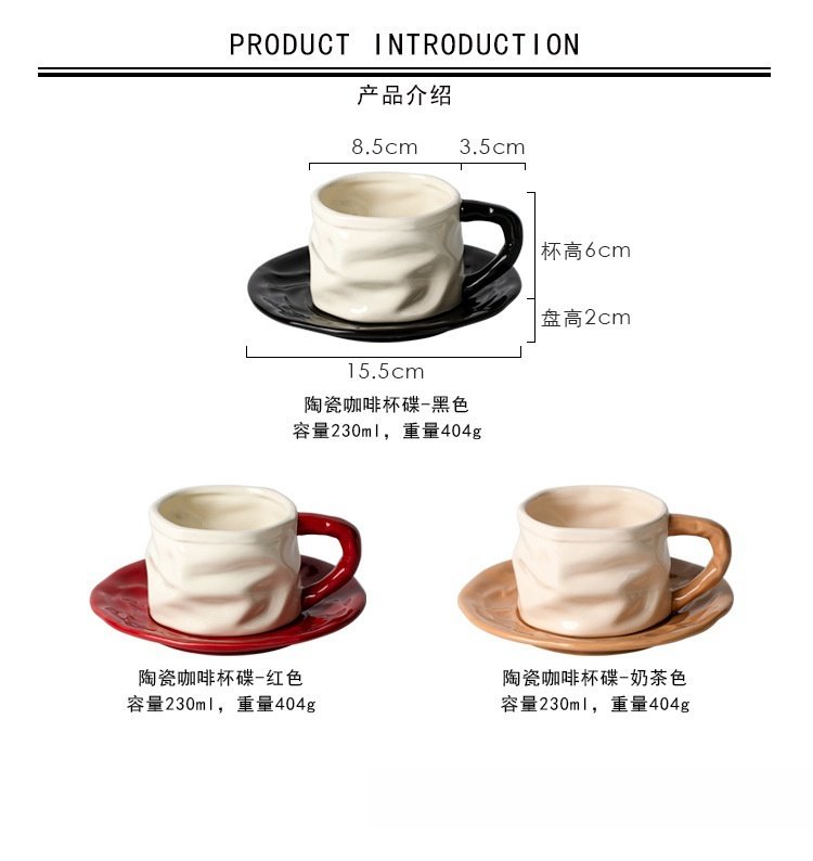 Introducing the Handmade Ceramic Vintage English Coffee Tea Cups and Saucers Set, a one-of-a-kind collection that brings artistry and functionality together. The handmade design features a smooth, crinkled surface, adding texture and personality to each piece. Available in three distinct colors—Black, Red, and Tan—this set offers a personalized touch to your tea or coffee ritual. The unique look is complemented by a well-formed handle for a comfortable grip. If you appreciate vintage bone china tea cups​, this set provides an interesting alternative with its modern twist.