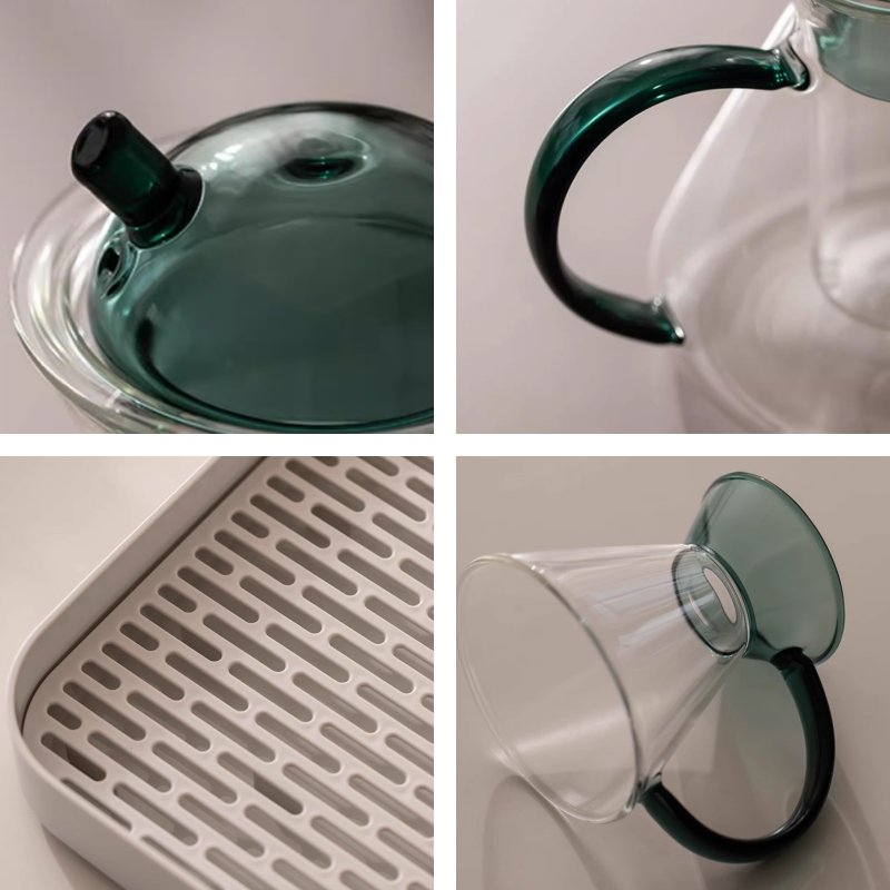The green handle on the teapot and cups provides not only an aesthetic appeal but also a functional design. Its ergonomic shape ensures a comfortable grip, making it easy to pour your tea without spills. The color contrast of the clear borosilicate glass with the green handle enhances the overall elegance of this tea set, making it a perfect addition to any modern home or office space. This green-themed design also pairs beautifully with various types of teas, from herbal to classic blends, making each tea-drinking session a delightful visual and sensory experience.