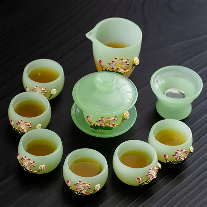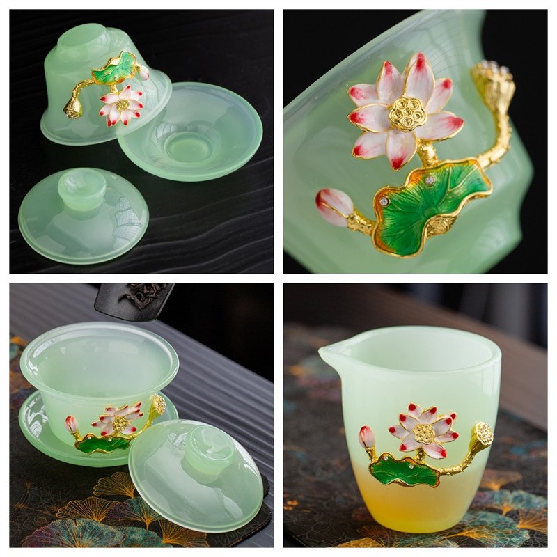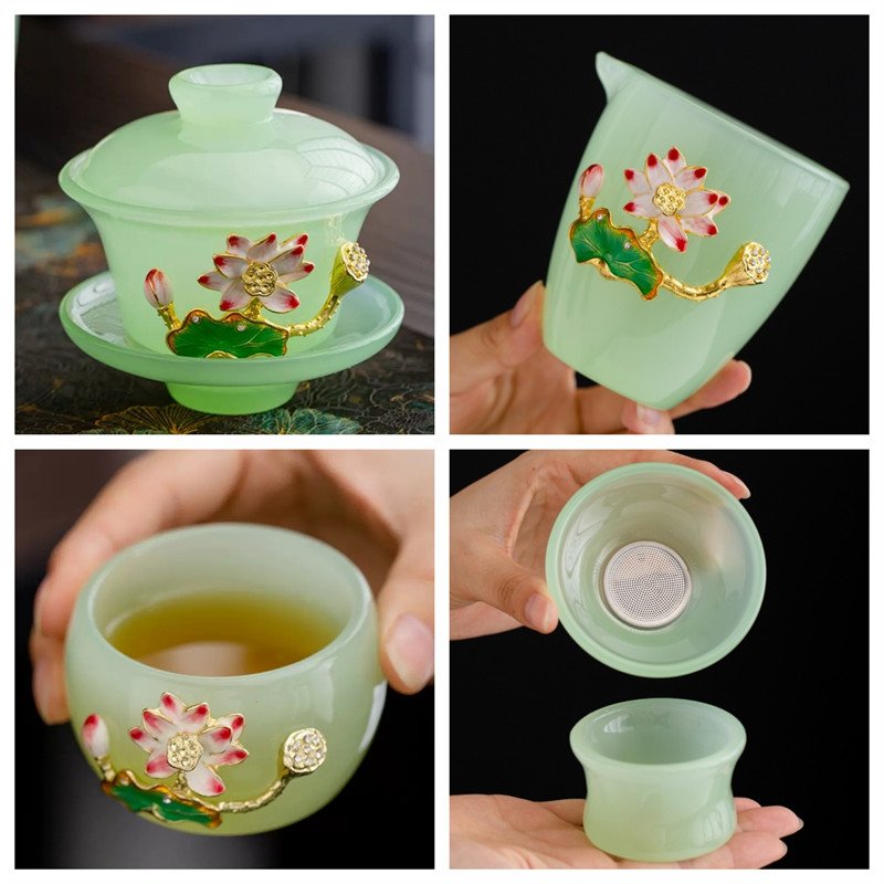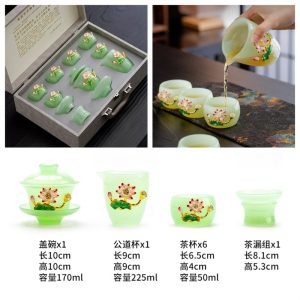 For those who love to enjoy their tea anywhere, the Inlaid Lotus Emerald Jade Colored Glaze Chinese Antique Gaiwan Tea Set is also a great addition to your collection. The set is compact and portable, making it an excellent choice for a best travel tea set. Now you can enjoy your favorite brews no matter where you are, without compromising on style or quality.