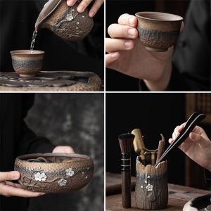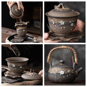 The unique iron glaze of this set gives the pottery a rustic, earthy feel, while the silver plum detailing adds a layer of refinement. The contrast of the glaze and the fine plum design elevates the aesthetic appeal of the set, making it a centerpiece in any tea corner. The use of rough pottery adds to the charm, highlighting the beauty of handcrafted ceramics. This set is a true testament to traditional craftsmanship, offering both beauty and functionality in every piece.