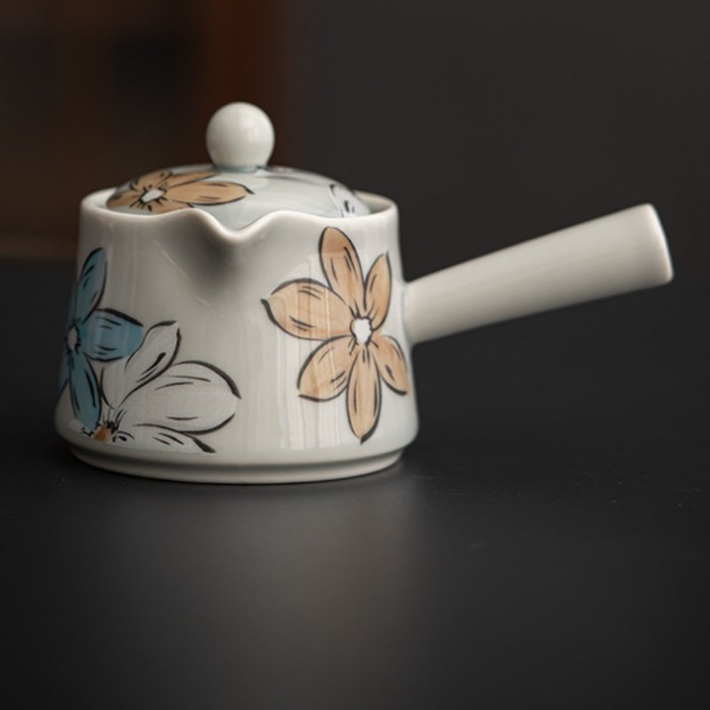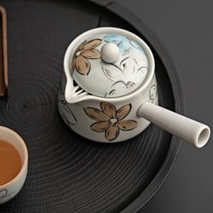 This Kyusu Japanese Ceramic Tea Kettle features an elegant ice ash glaze and hand-painted floral designs, with an ergonomic side handle for easy pouring, perfect for small tea gatherings and collectors.