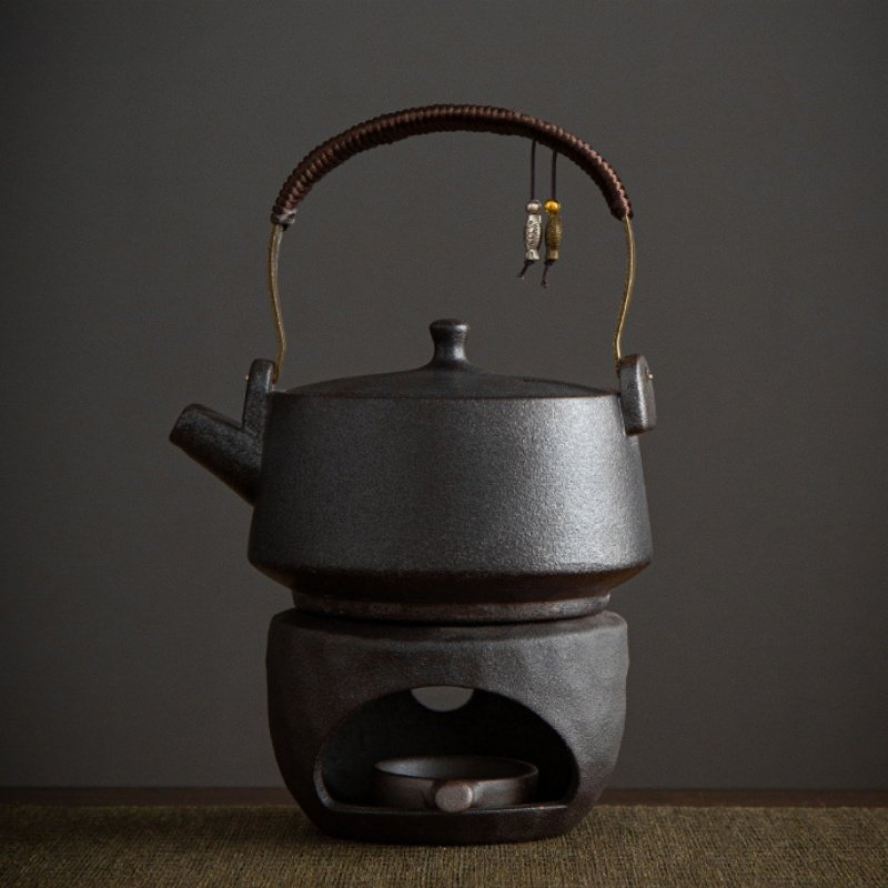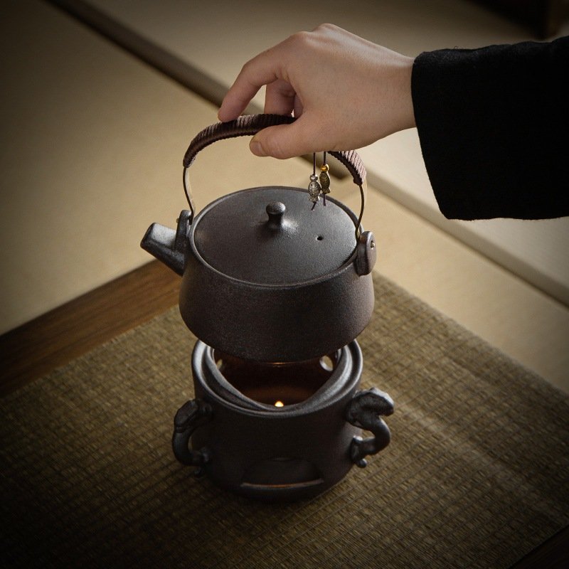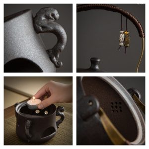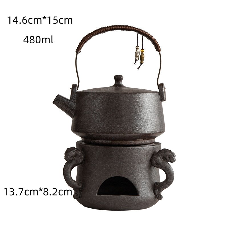 This teapot is a true work of art, featuring an elegant black pottery finish with intricate sculpted dragon-shaped handles on the warmer base. The curved, beaded handle adds a refined touch and ensures comfortable handling. A small decorative charm attached to the handle adds a unique, vintage feel, making this teapot not only functional but also a beautiful display piece.