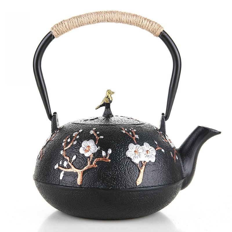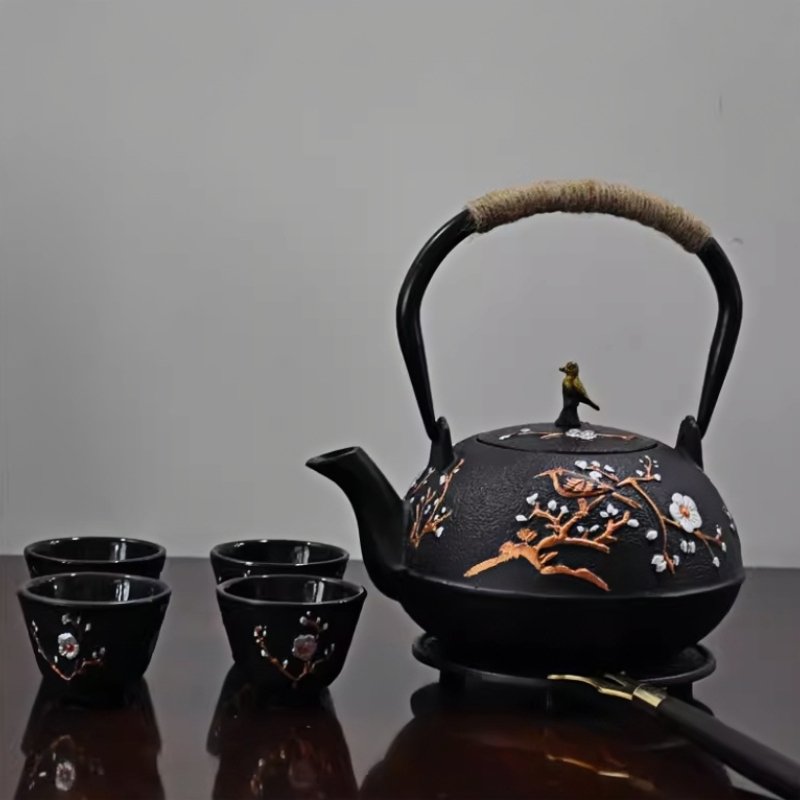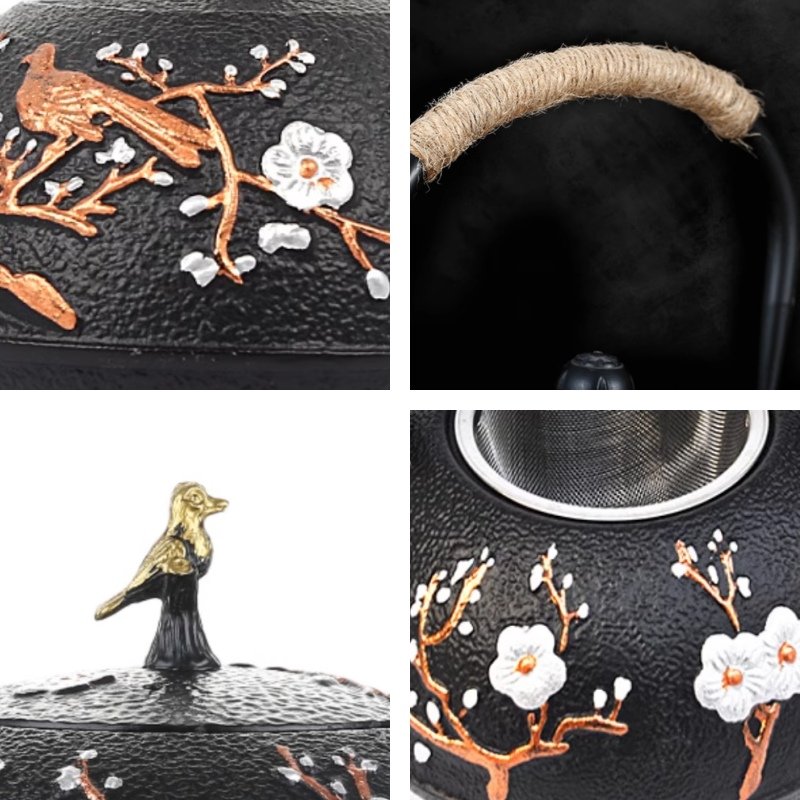Crafted with meticulous attention to detail, this enameled cast iron tea kettle features a delicate magpie and plum blossom motif. These elements symbolize good fortune and natural beauty, making this teapot set an ideal choice for both tea brewing and as an elegant decorative item. The durable cast iron ensures that the teapot retains heat efficiently, maintaining the perfect temperature for your tea over an extended period. This set brings a touch of antique charm to your home.