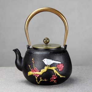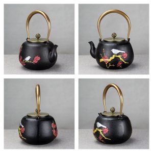 The Large Capacity Cast Iron Tea Kettle Enameled with Bird and Red Flower Pattern is a perfect combination of traditional design and superior functionality. With its stunning craftsmanship, this teapot is designed for both functionality and aesthetic appeal. The kettle’s cast iron tetsubin teapot construction ensures excellent heat retention, keeping your tea warm for an extended period while preserving its flavor. The beautiful bird and red flower design is hand-painted, adding an elegant touch to any tea ceremony or gathering.