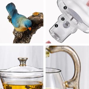 The Lifelike Bird and Gilded Glaze Ceramic Tree Glass Lazy Semi-Automatic Tea Set features an artistic bird design, high borosilicate glass, and a semi-automatic pouring system, combining beauty and convenience for tea enthusiasts.