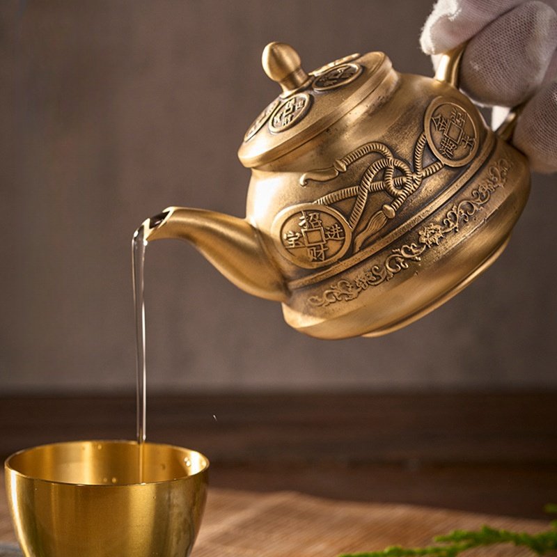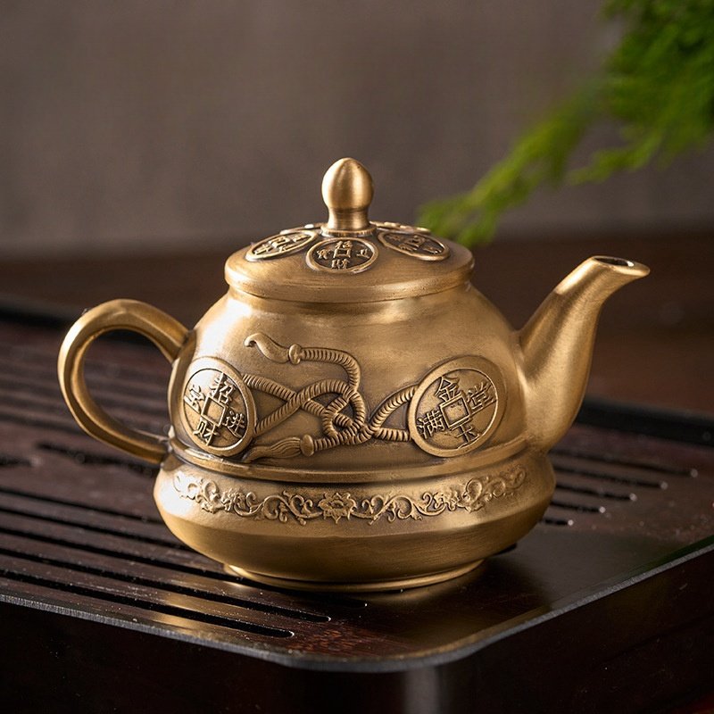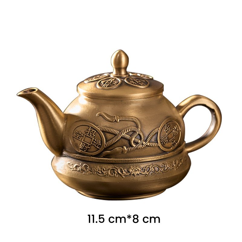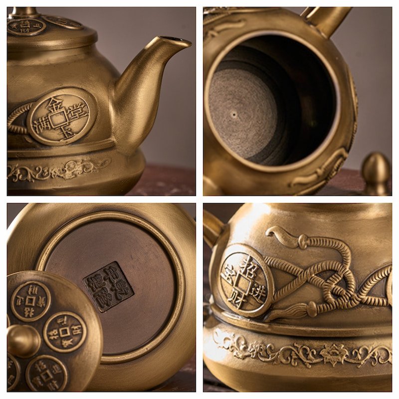 Add a touch of elegance and prosperity to your tea collection with this luxurious antique brass teapot, featuring intricate traditional money symbols that represent wealth, success, and good fortune.