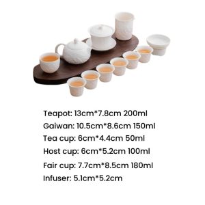 This set is designed to complement the Tea service set with tray style of tea brewing. The Gaiwan and Fair Cup allow for controlled steeping of the tea, ensuring that every infusion is full of flavor. The Chinese teapot set is designed for smooth pouring, making the brewing and serving experience both elegant and efficient. Whether you’re new to Gongfu tea brewing or a seasoned enthusiast, this set will serve you well.