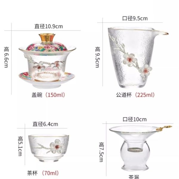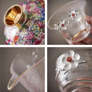 This exquisite tea set is designed with luxurious silver inlaid plum flowers on each piece, adding an elegant and sophisticated touch to your tea ceremony. The fine antique enamel finish enhances the beauty of the plum blossoms, which create a visually striking contrast with the transparent glass. Each piece is a masterpiece that embodies elegance. If you appreciate beautiful tea sets, you may also enjoy our transparent glass tea set.