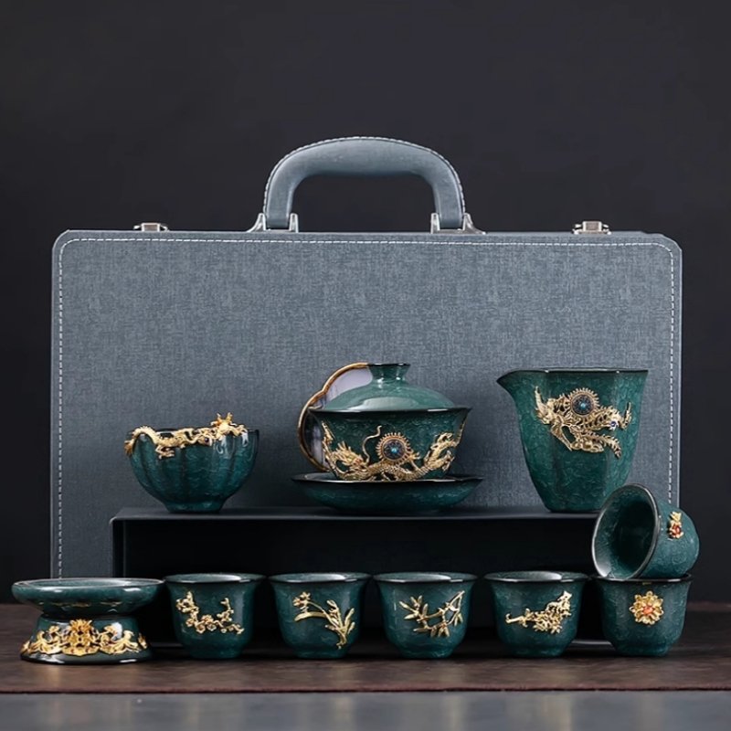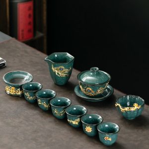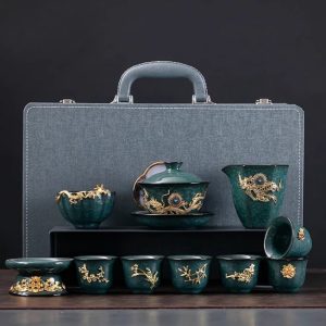 The Luxury Vintage Chinese Green Ice Crackle Glaze Gongfu Tea Pot Set with Gold Inlaid Jade Dragon and Phoenix makes an extraordinary gift for tea lovers, collectors, or anyone who appreciates fine craftsmanship. Its unique design, high-quality porcelain, and rich cultural symbolism make it a thoughtful and elegant gift that will be cherished for years. To create the perfect gift set, pair it with a dragon tea cup set for a complete experience.