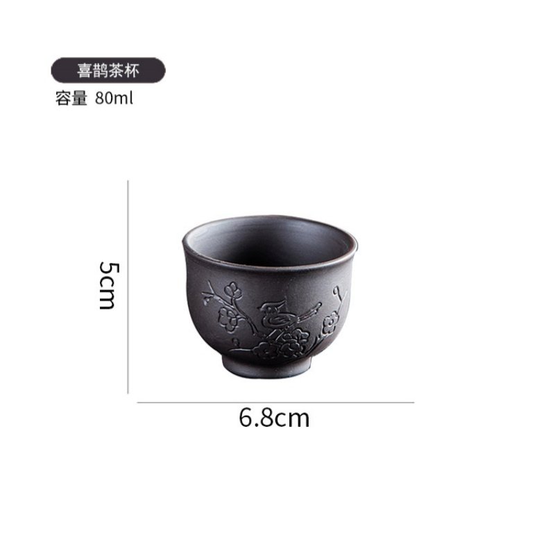 The magpie is a symbol of joy, happiness, and good luck in Chinese culture. Its presence on a branch of flowers represents a harmonious life full of prosperity and blessings. The hand-carved details on each cup make this tea set not just a functional item, but a meaningful symbol of Chinese tradition and artistry. For other designs featuring symbolic elements, explore our yixing clay tea cup collection.
