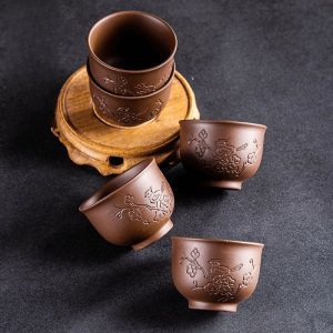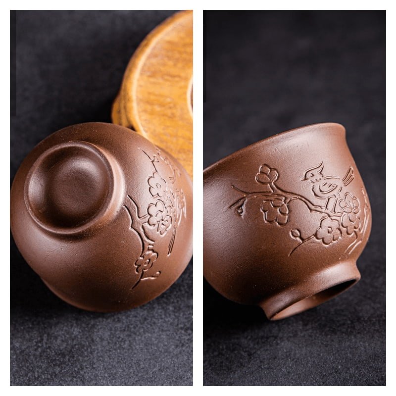 The Magpie on Branch Traditional Authentic Purple Clay Yixing Tea Cups Set brings both tradition and beauty into your tea-drinking experience. Made from Yixing purple clay, these tea cups feature delicate hand-carved designs of a magpie perched on a branch, a symbol of good fortune and happiness in Chinese culture. The set consists of six cups, each uniquely designed with this intricate floral and bird motif. This set is perfect for those who appreciate fine tea ware with deep cultural significance.