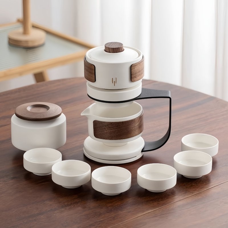 One of the standout features of this Modern Creative White Porcelain Rotating Lazy Kung Fu Semi-Automatic Tea Set is its rotating mechanism. The teapot is designed to rotate, making it easier to serve tea without the need for complicated movements. This semi-automatic feature ensures smooth, controlled pouring, which not only enhances the tea-drinking experience but also adds a fun and innovative twist to your tea ritual.