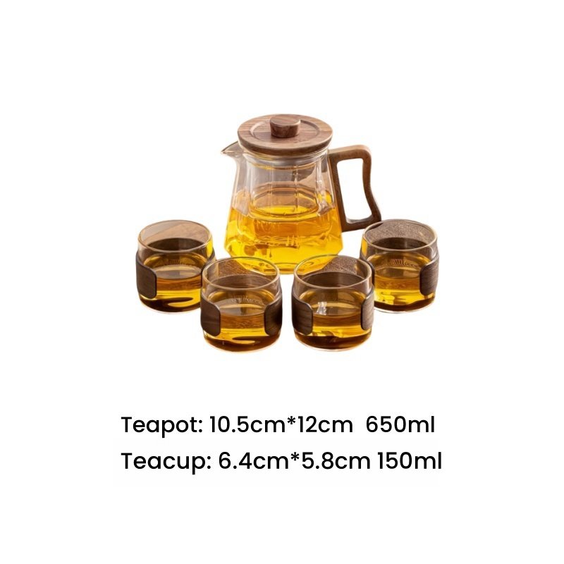 The modern, minimalist design of this glass tea set is perfect for today’s contemporary homes. The set comes with a beautifully crafted teapot (650 ml / 22 fl oz) and four teacups (150 ml / 5 fl oz) made from borosilicate glass, which is renowned for its resistance to high temperatures. The wooden handle and lid not only offer ergonomic comfort but also add an earthy charm, blending seamlessly with the glass components. This tea set is ideal for sipping tea solo or sharing with friends and family.
