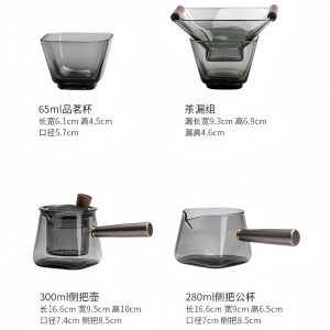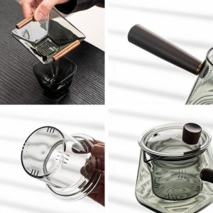 The unique wooden side handle gives this set a modern twist, adding a touch of warmth to the cool elegance of the transparent and grey borosilicate glass. The handle is not just aesthetically pleasing, but also practical, providing a comfortable grip for easy pouring. Whether you’re serving tea during a formal gathering or enjoying a quiet moment by yourself, this tea set is sure to make a statement. The transparent glass allows you to witness the beauty of your tea as it brews, making the experience visually delightful as well as flavorful.