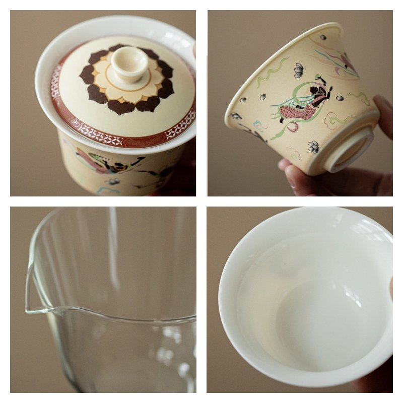 The Painting Flying Apsaras Mural adorning the gaiwan and teacups showcases the intricate art of traditional Chinese murals. The depiction of elegant flying apsaras, graceful dancers from ancient Chinese mythology, adds an artistic touch to this set, making it not just functional but a piece of cultural history. The intricate details on the teacups and gaiwan offer a visually striking and serene experience while brewing your tea.