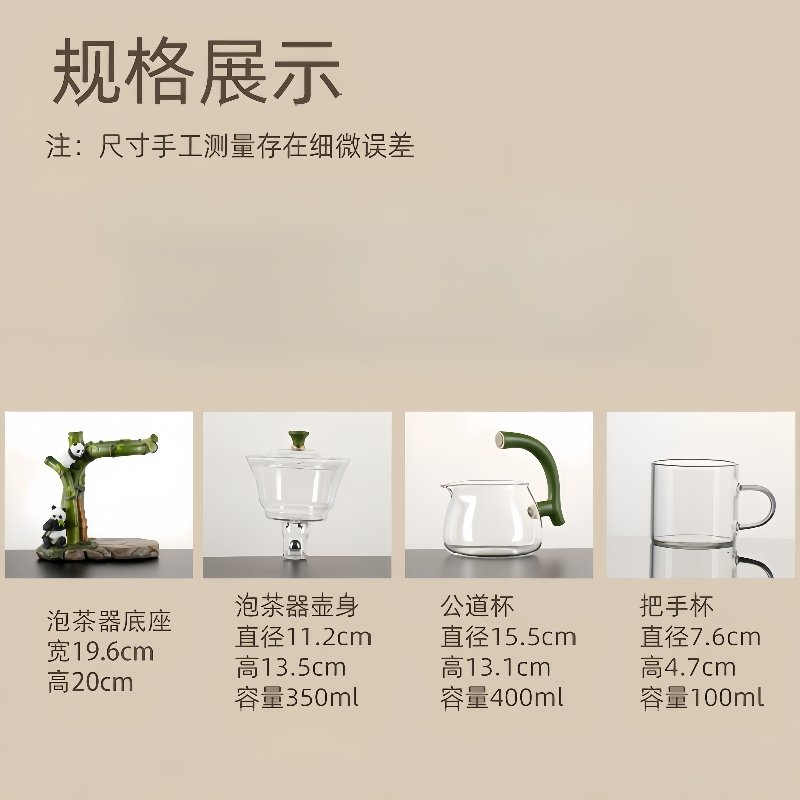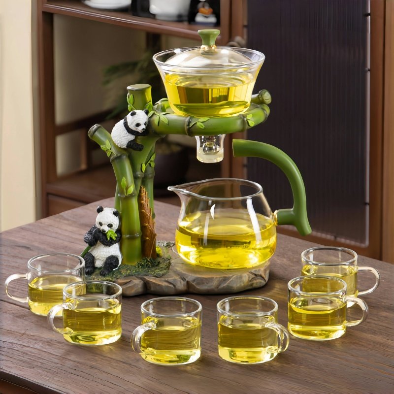 The Pandas Playing on Bamboo Semi-Automatic Lazy Kungfu Glass Tea Set combines playful panda figurines, premium glass construction, and a semi-automatic pouring system, making it perfect for traditional tea ceremonies and casual tea sessions.